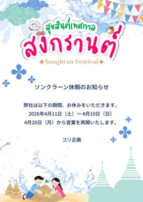 NEWS お知らせ HOME ABOUT US NEWS PAST WORKS VOICE BLOG ACCESS 2026/02/25 2026年ソンクラーン休暇のお知らせ バンコク本社および東京オフィスはソンクラーン(タイ正月)休暇のため、以下の期間お休みをいただきます。 2026年4月11日(土)~4月19日(日) ご迷惑をおかけいたしますが、ご理解のほどよろしくお願い申し上げます。 一覧に戻る 次へ HOME > NEWS > 2026年ソンクラーン休暇のお知らせ
