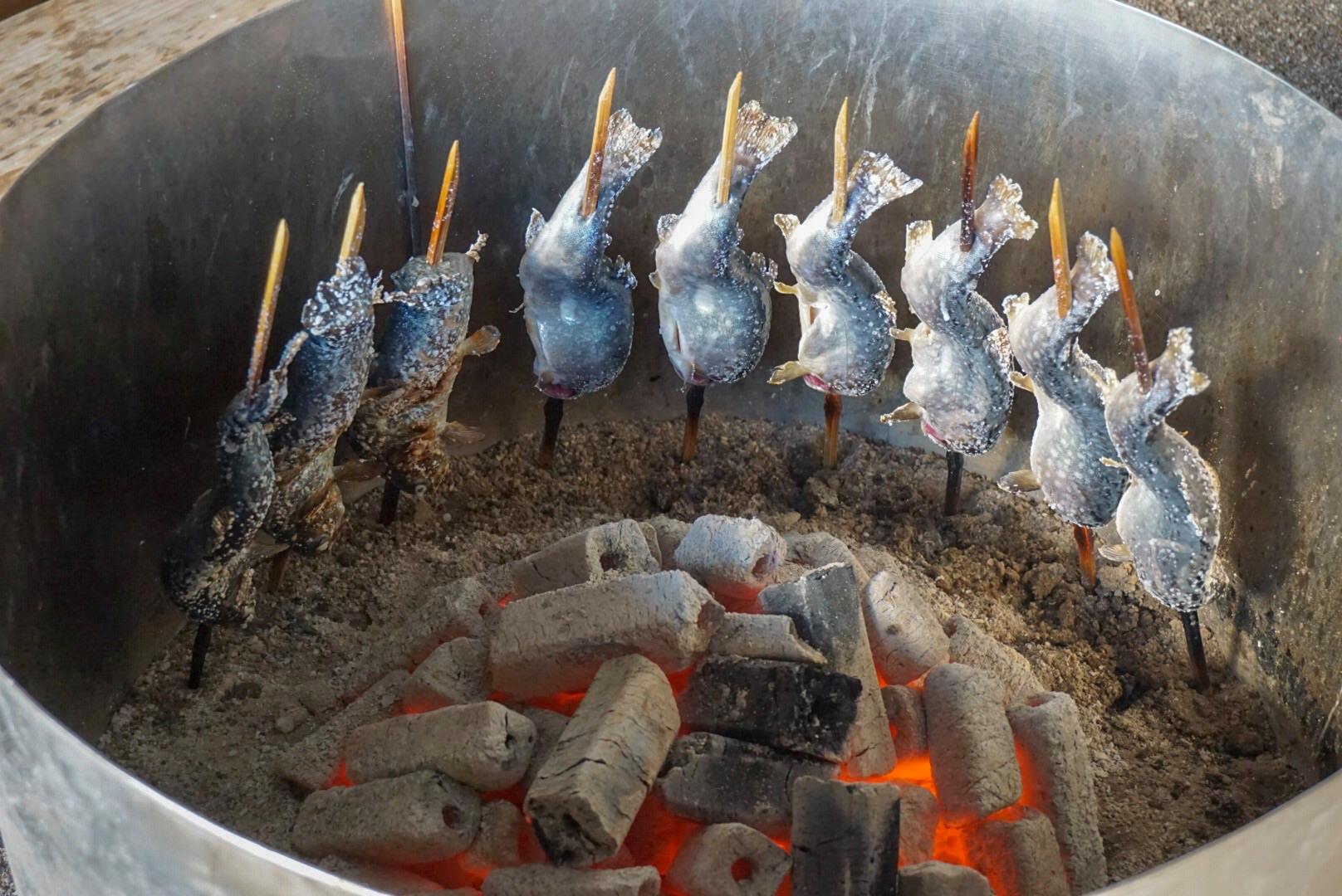 ปลาอิวานะจับสดใหม่ทุกวัน นำมาเสียบไม้โรยเกลือย่างในเตาถ่าน จนกลิ่นปลาย่างหอมฟุ้งไปทั่ว กลิ่นชวนให้น้ำย่อยในกระเพาะทำงานเสียจริง