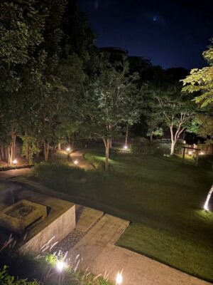 日が暮れてきてお庭もいい感じにライトアップされています。