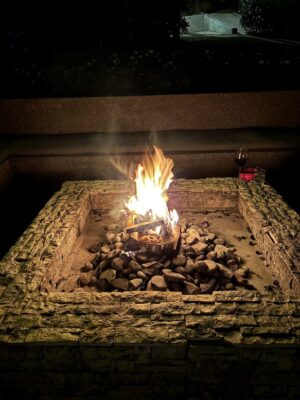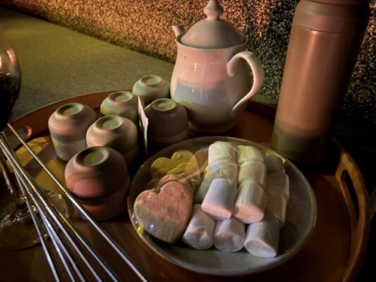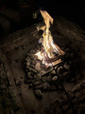 そして夜のお楽しみは・・キャンプファイヤーです。お庭の暖炉に火をつけてくれて、そこでお茶を飲んだり焼きマシュマロをすることができます。