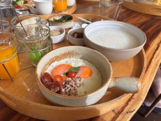 朝食とドリンクは前日にオーダーしたものが時間に届きます。洋食もタイ料理も選べますよ。