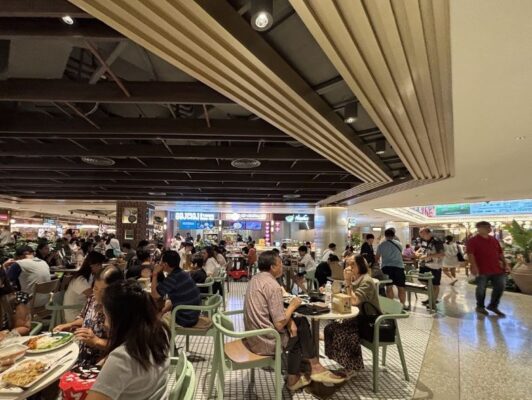 地下は巨大なフードエリアで、ミシュラン掲載店や屋台料理70店舗以上を集めた「Parkside Market」です。週末の夕方らしく、すでに多くの人で混んでいました。