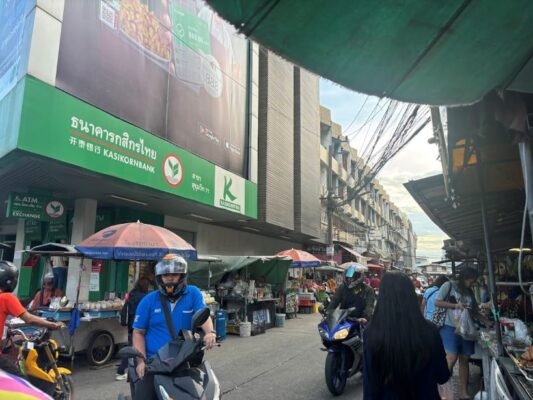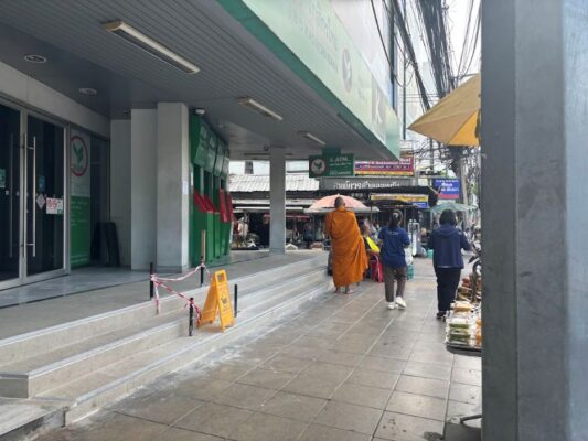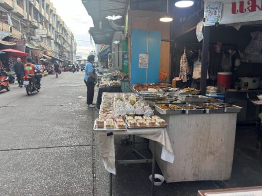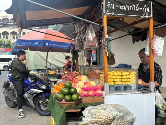道を渡ると、小さなソイがあり、朝ごはんやフルーツ屋台がたくさん出ていますよ。
