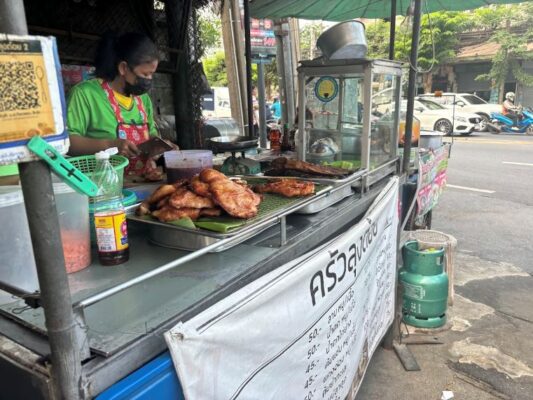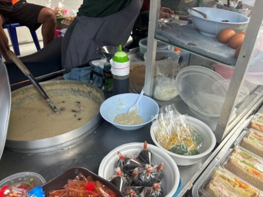 タイの人は朝ごはんをこういった屋台で買ってオフィスで食べることが多いです。私のお気に入りはジョーク「おかゆ」です。しょうがやネギをたくさん入れて、ナンプラーでいただくととっても美味しいです。