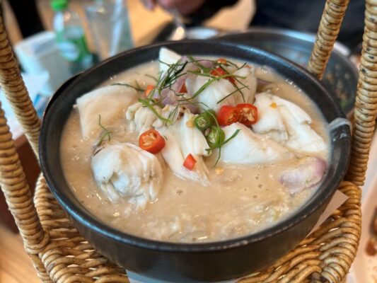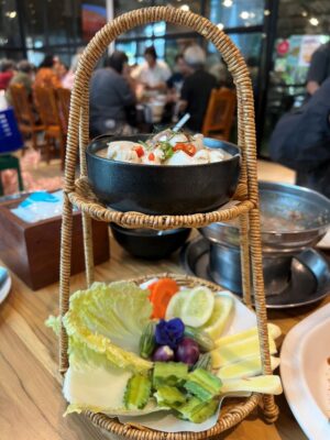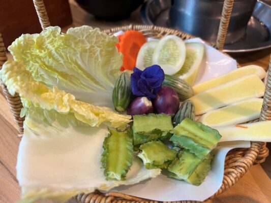 タイのバーニャカウダと言っても良いのでしょうか?味は異なりますが、濃厚なディップソースで大きな蟹の身が入っているのが特徴です。ゆでた野菜、生野菜を付けながらいただきます。今までご紹介させていただいたお店のものもどこも美味しかったですが、こちらのもとっても美味しかったです!お料理の盛り付けも素敵ですね。