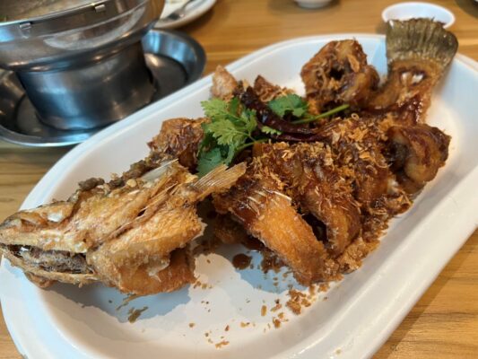 揚げたお魚一匹に甘めのマカーム(タマリンド)ソースをたっぷりかけていただきます。