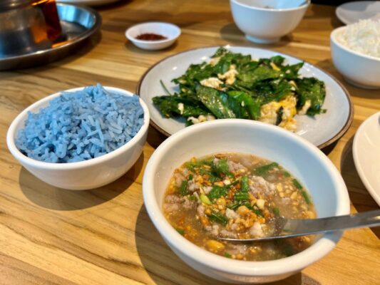 これらのおかずと一緒にいただくために、普通のタイ米とアンチャン(バタフライピー)で色付けしたものの両方を頼みました。