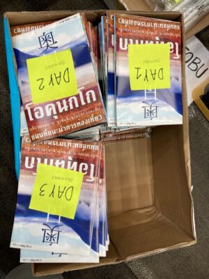 ก่อนวันงานจริงจะมาถึงทุกคนก็ต้องเตรียมตัวกันไม่น้อยเลยค่ะ ตั้งแต่เช็กโบรชัวร์ว่าข้อมูลถูกต้องหรือว่าต้องแก้ไขตรงไหนเพิ่มเติมไหม ไปจนถึงอุปกรณ์ที่ต้องใช้ประจำบูท เพื่อให้มั่นใจว่าทุกอย่างพร้อมสำหรับงานใหญ่ที่กำลังจะมาถึงนี้ค่ะ ไม่กี่วันก่อนเริ่มงานพี่ ๆ ก็ติวเข้มสรุปความรู้แบบฉบับเร่งด่วนให้กับฉันจนค่ำมืดเลยล่ะ (ขอบคุณนะคะ😭) เพื่อให้ตัวฉันเข้าใจและพร้อมตอบคำถามของผู้มางานได้มากที่สุด บรรยากาศเหมือนกำลังติวเข้มเพื่อไปสอบ มีข้อมูลที่ฉันต้องรู้และทำความเข้าใจมากมายเลยล่ะ พี่แนนกับพี่เฟิร์นโรลเพลย์ให้ดูด้วยนะ ว่าถ้ามีคนเข้ามาสอบถามในบูทต้องตอบยังไง คำถามแบบไหนที่จะโดนถาม