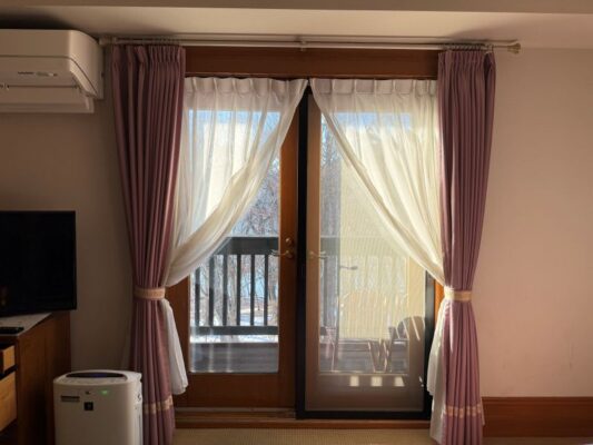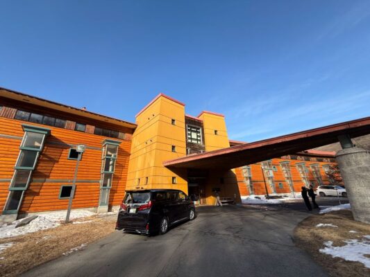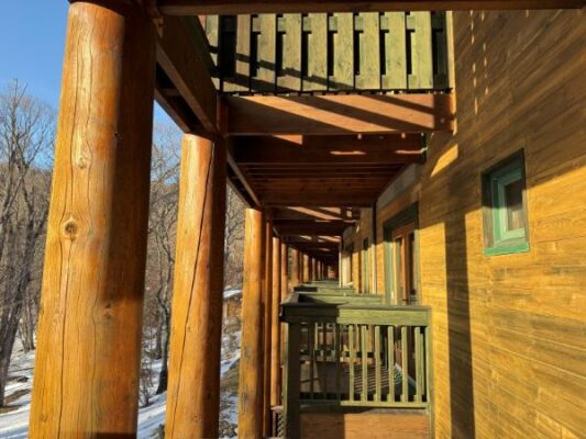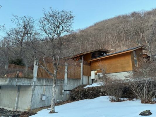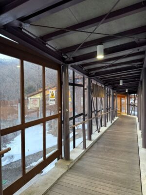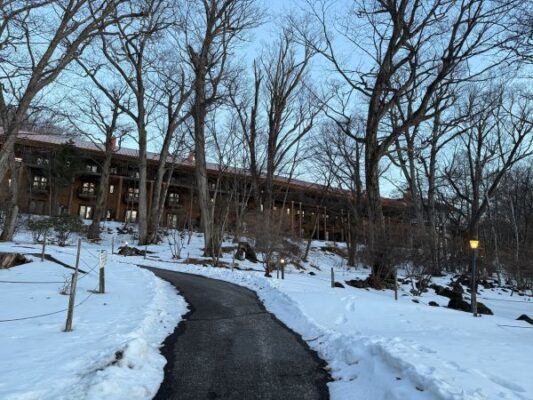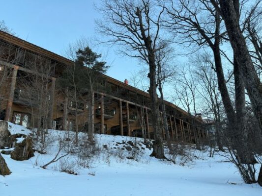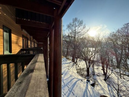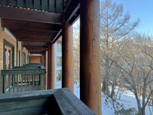ชมวิวของโรงแรมจากด้านนอก อาคารสร้างด้วยไม้พร้อมระเบียงสไตล์ตะวันตกที่ตั้งอยู่ท่ามกลางหิมะ ดูแล้วให้ความรู้สึกอบอุ่นไปอีกแบบ (ทั้ง ๆ ที่อากาศหนาว…~)