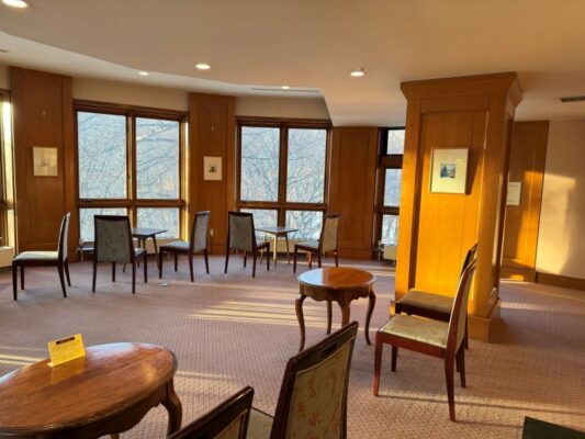 โถงกลางโรงแรมทุกชั้นเป็นจุดนั่งพักคล้ายกับเลานจ์ มีกระจกบานใหญ่เรียงต่อกันทำให้เห็นบรรยากาศด้านนอกที่เป็นวิวทะเลสาบชูเซ็นจิและธรรมชาติที่จะเปลี่ยนไปตามฤดูกาล