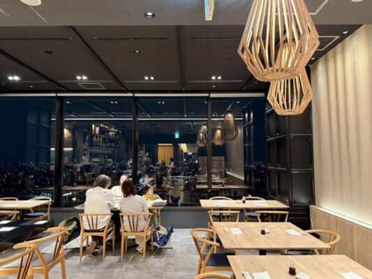 นอกจากความสว่างไสวภายในร้านแล้ว จากหน้าต่างที่กว้างตลอดทั้งแถบของร้านก็ยังระยิบระยับไปด้วยความมีชีวิตชีวาของเมืองยามค่ำคืน