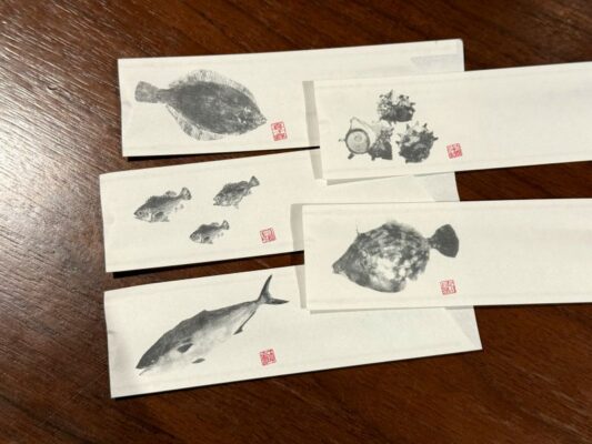 แถมความน่ารักของถุงกระดาษใส่ตะเกียบของร้าน เป็นลวดลายอาหารทะเลที่แตกต่างกัน น่ารักมากเลย~