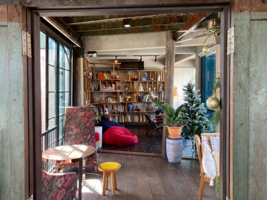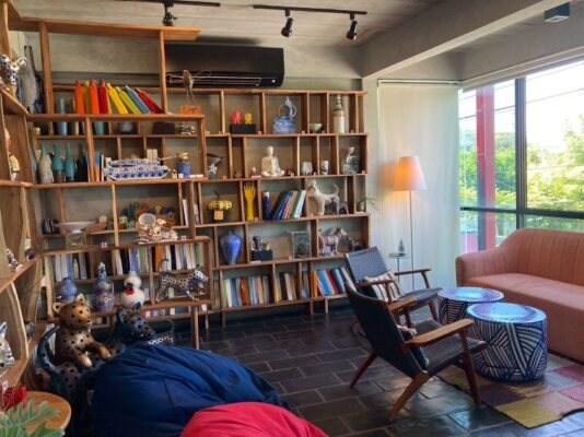 เดินถัดมาอีกจะเจอกับพื้นที่นั่งเล่น มีชั้นวางที่เต็มไปด้วยหนังสือกับงานเซรามิกเรียงรายอยู่ มีแสงแดด
