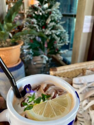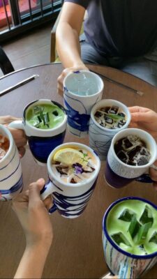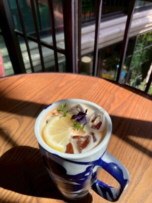 แถ่น แท๊น ชามะนาวแก้วเบ้อเริ่มเลย ด้านบนมีเลม่อนกับดอกอัญชันวางอยู่ด้วย 🍋 บอกเลยว่าหน้าตาดูดีมาก แก้วเซรามิกใบนี้ก็น่ารักสุด ๆ เลย (อยากหิ้วกลับบ้านสักใบจังค่ะ 555)