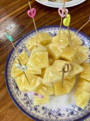 ทานของคาวกันหมดแล้วมาปิดท้ายกันด้วยสับปะรดหวานฉ่ำ เย้~ (ไม้จิ้มน่ารัก 😍)