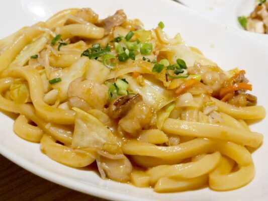 เส้นอุด้งอวบอ้วนเหนียวนุ่มและเครื่องในเหนียวหนุบหนับเคี้ยวเพลิน ผัดบนกระทะเทปันยากิ หรือกระทะแบน ได้กลิ่นหอมรมควันนิด ๆ ราสซอสผัดแบบฉ่ำ ๆ น้ำซอสเคลือบเส้นและเครื่องใน ยิ่งกินยิ่งเพลิน
