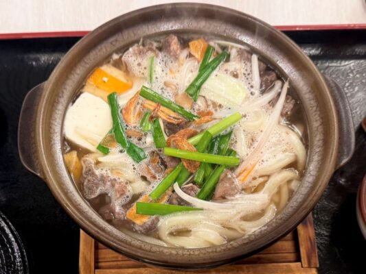 เมนูแรกที่ต้องพูดถึงเลยก็คือ “โฮรุมงอุ้ง” (ホルモンうどん) อาหารท้องถิ่นที่อัดแน่นด้วยจิตวิญญาณของเมืองสึยามะ และจัดว่าเป็นอาหารระดับ B ของญี่ปุ่น (B級グルメ) ที่ราคาเป็นมิตร หารับประทานได้ง่าย และได้รับความนิยมในท้องถิ่น